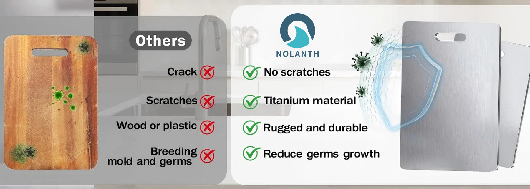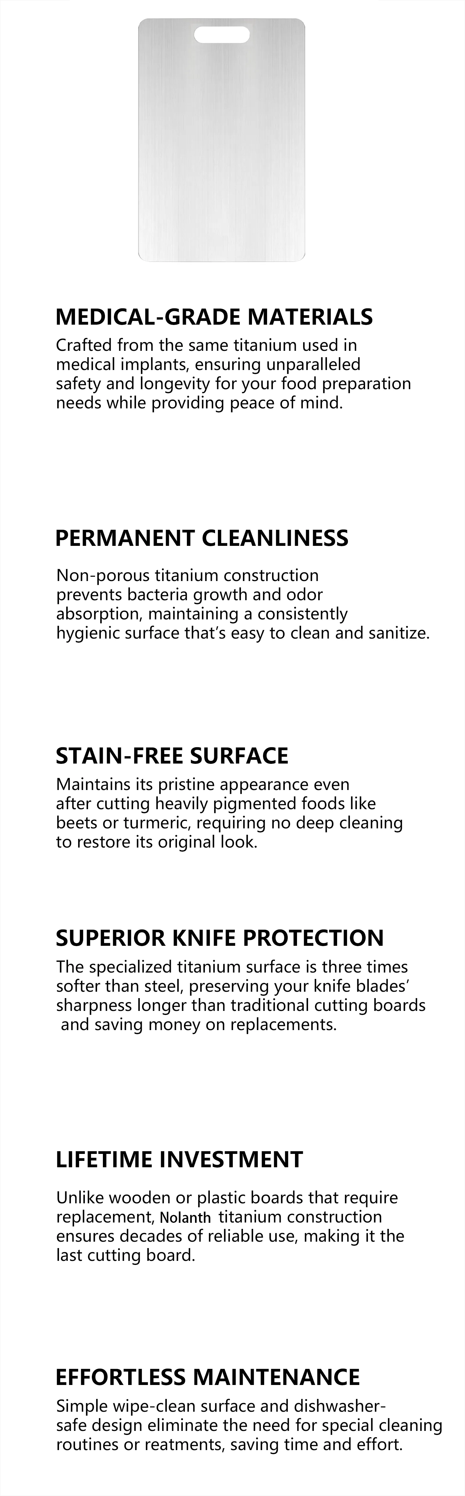 Titanium is an incredibly strong, lightweight material that won't rust, corrode, or harbor bacteria. Nolanth is designed for professionals and home cooks who demand the best in hygiene, durability, and performance. Elevate your kitchen with the unmatched purity and strength of titanium.