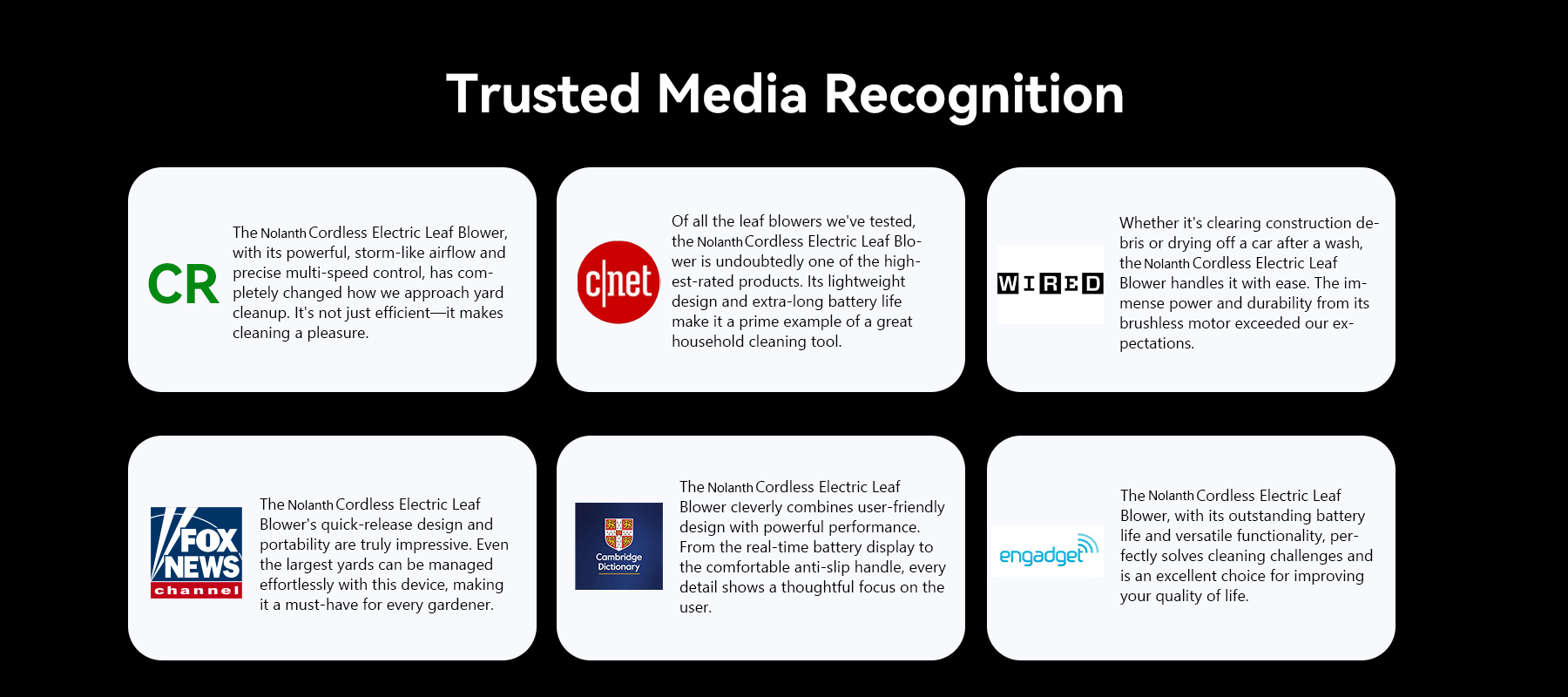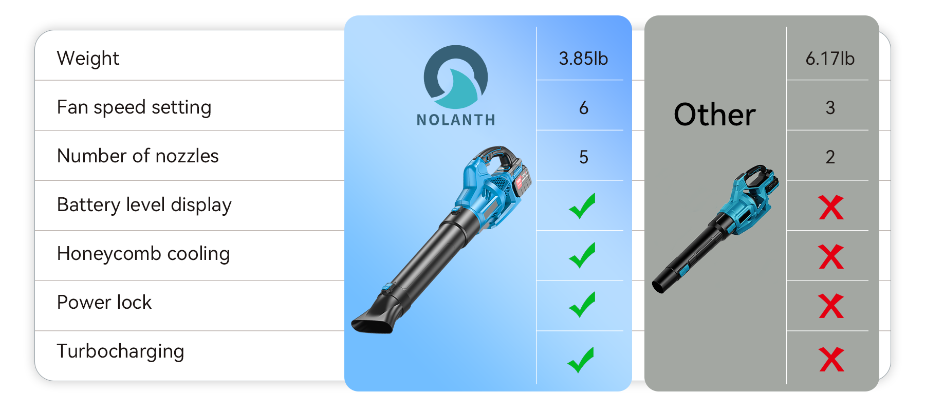 The Nolanth Leaf Blower features a honeycomb cooling vent design that rapidly dissipates heat and effectively prevents the motor from overheating. This not only guarantees the machine's durability but also ensures your safety and peace of mind while enjoying powerful, efficient cleaning.